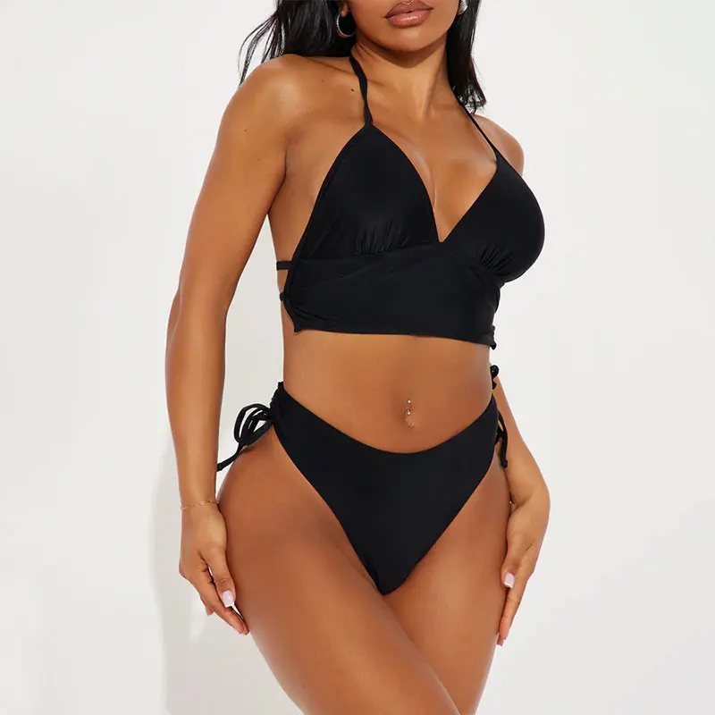 Huili Factory OEM Custom Print Side Ties Design Women's Swimwear Two Piece Ruched Detailing Beachwear Halter Neck Bikini Set
